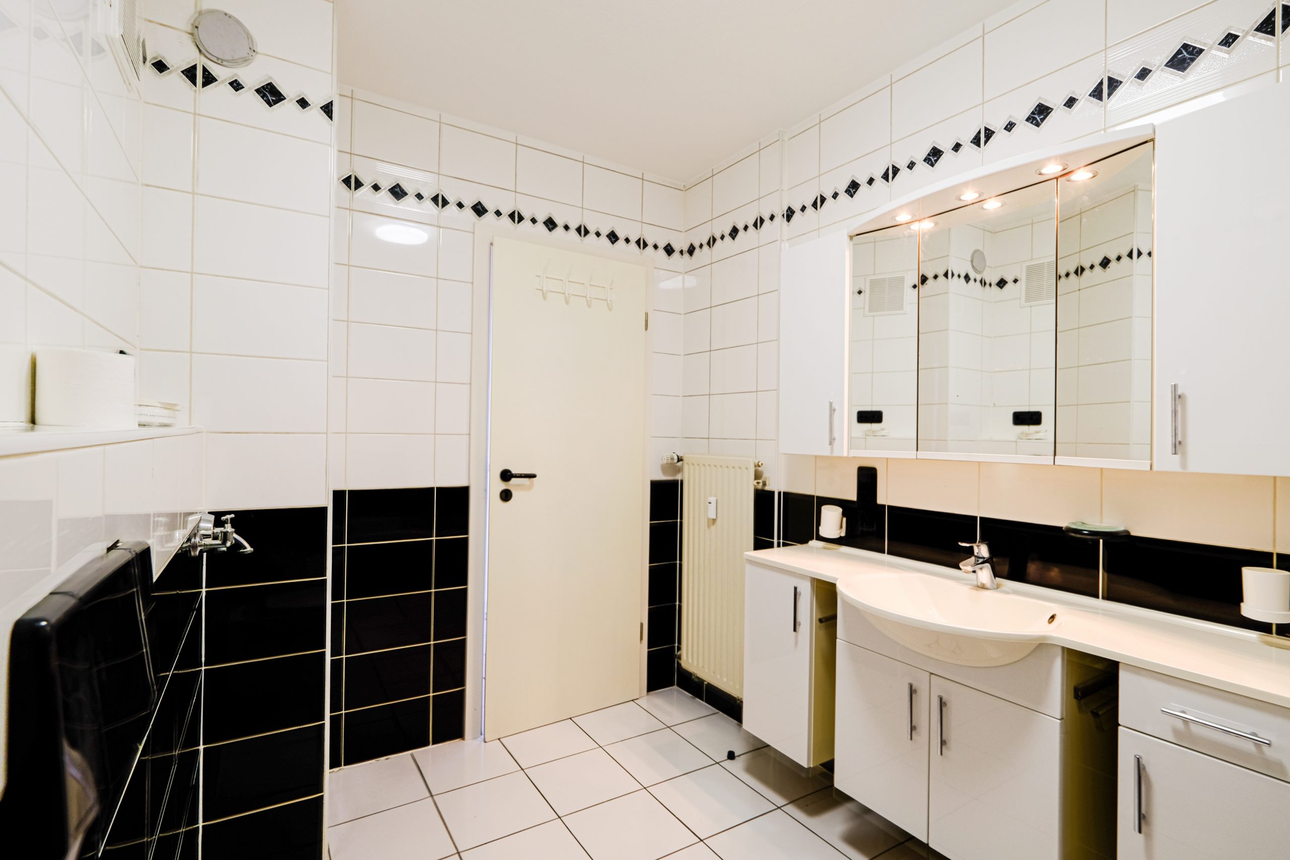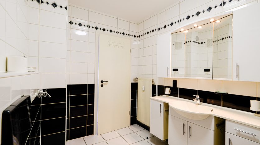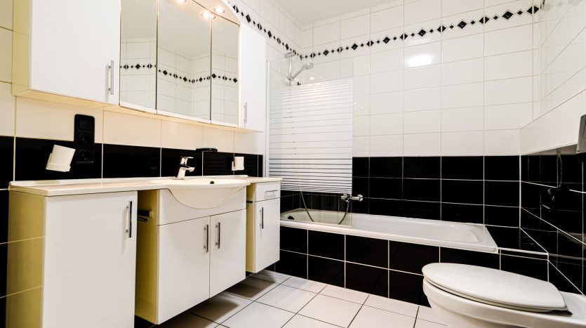 – Salle de bain avec WC, baignoire, lavabo et coin buanderie.