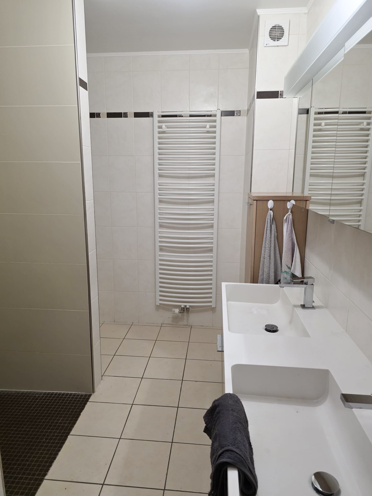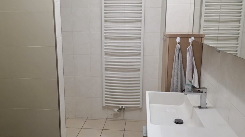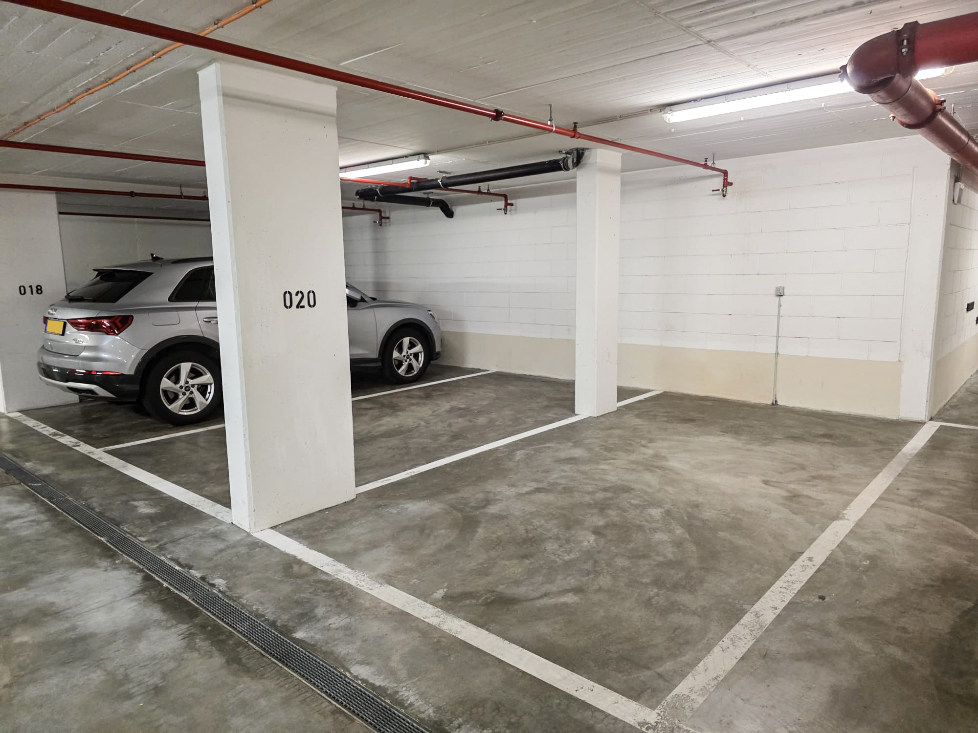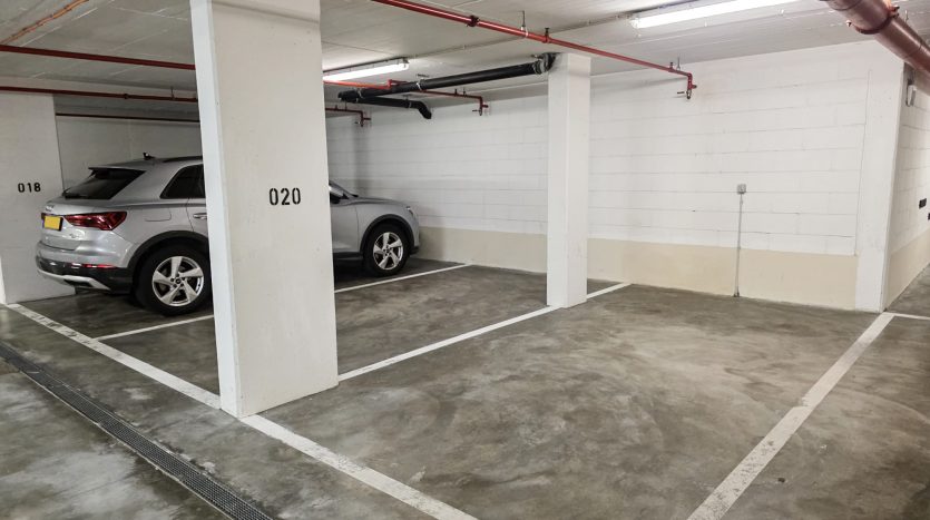 À ceci s’ajoute un emplacement intérieur avec électricité +/- 12,40m2 et une cave privative 3,24m2.