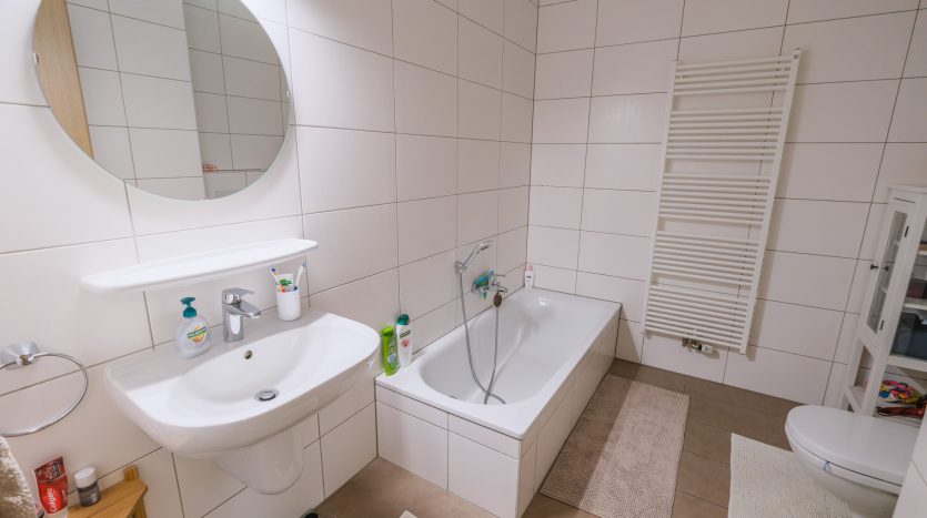 – salle de bains avec baignoire, simple lavabo, WC et ventilation.