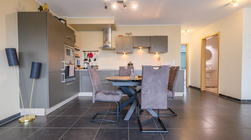 – cuisine équipée ouverte sur le living / salle à manger avec vidéophone et accès au balcon orienté vers l’avant du bâtiment,