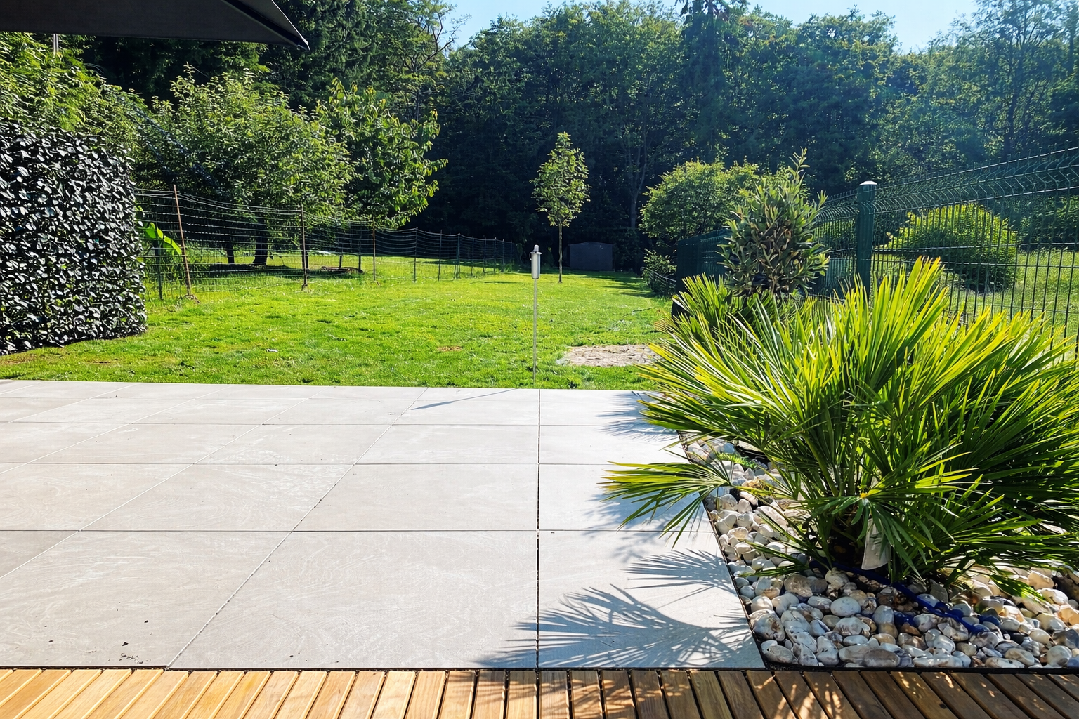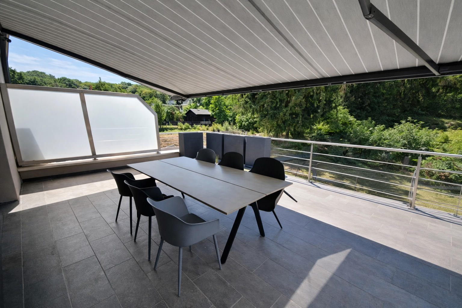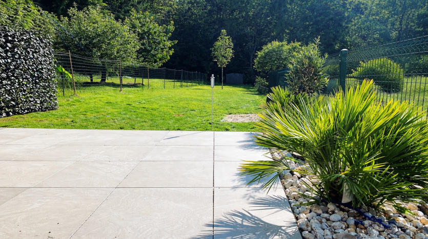 – Terrasse de +/- 35 m2 avec accès direct au jardin et vue dégagée,
