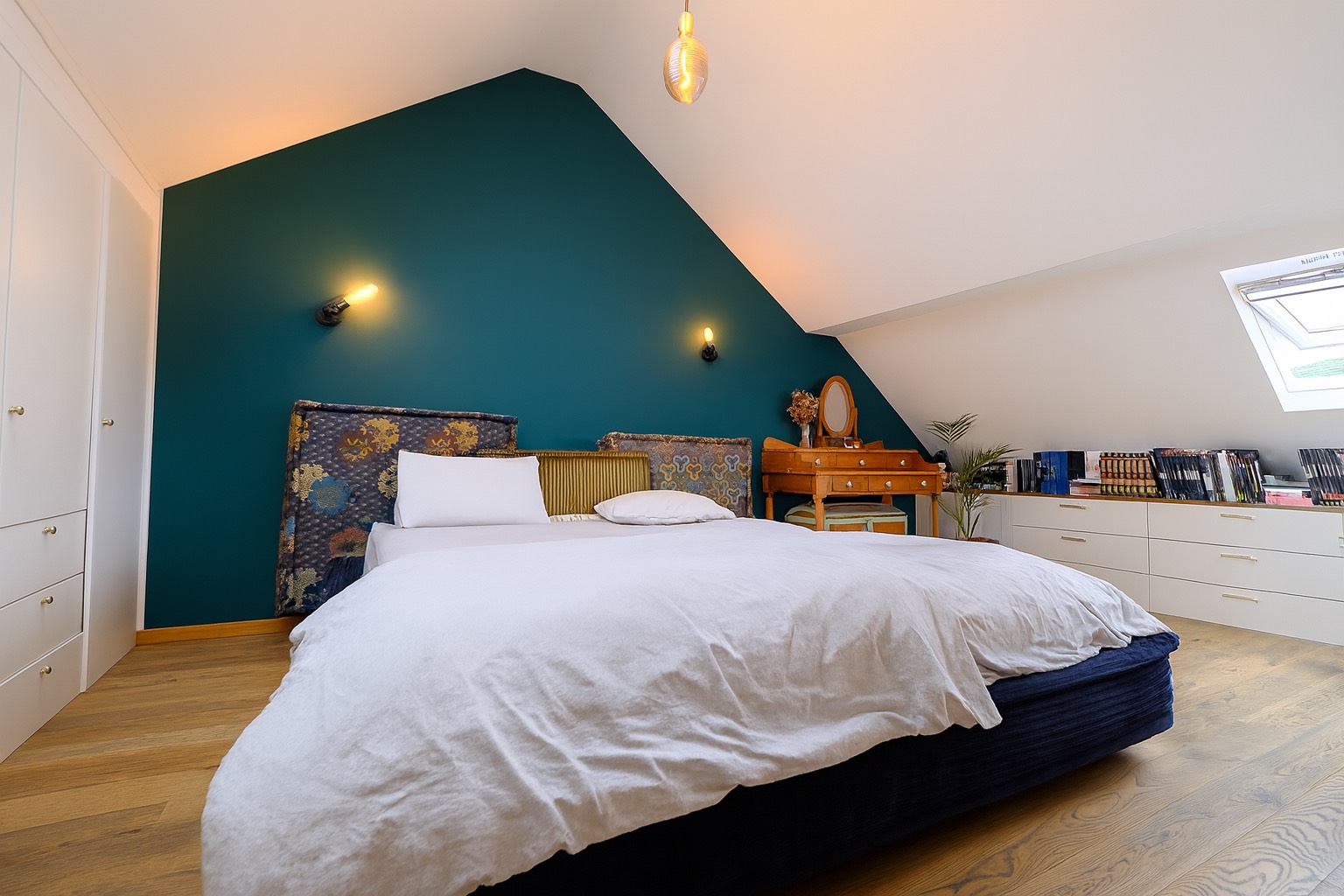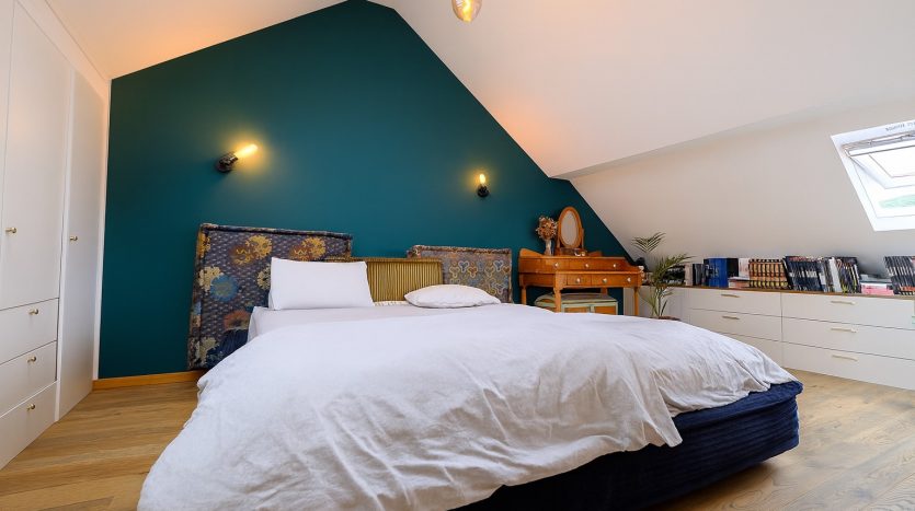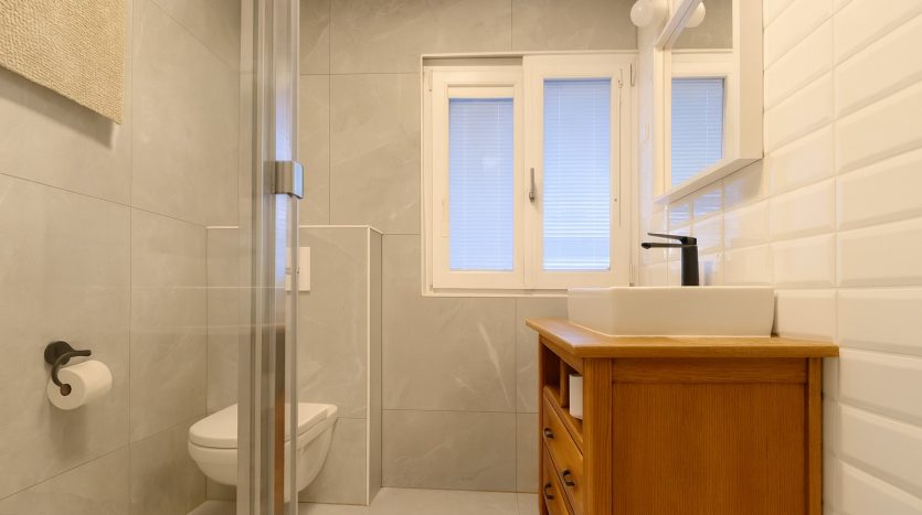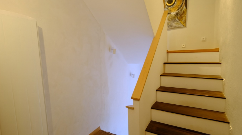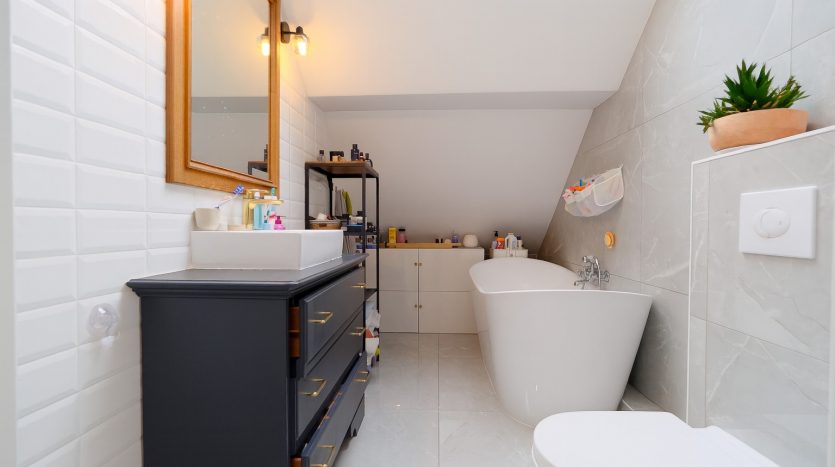 – Salle de bain avec WC, baignoire, simple lavabo avec armoire murale, miroir et velux.