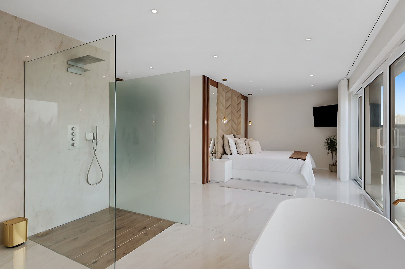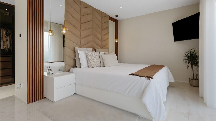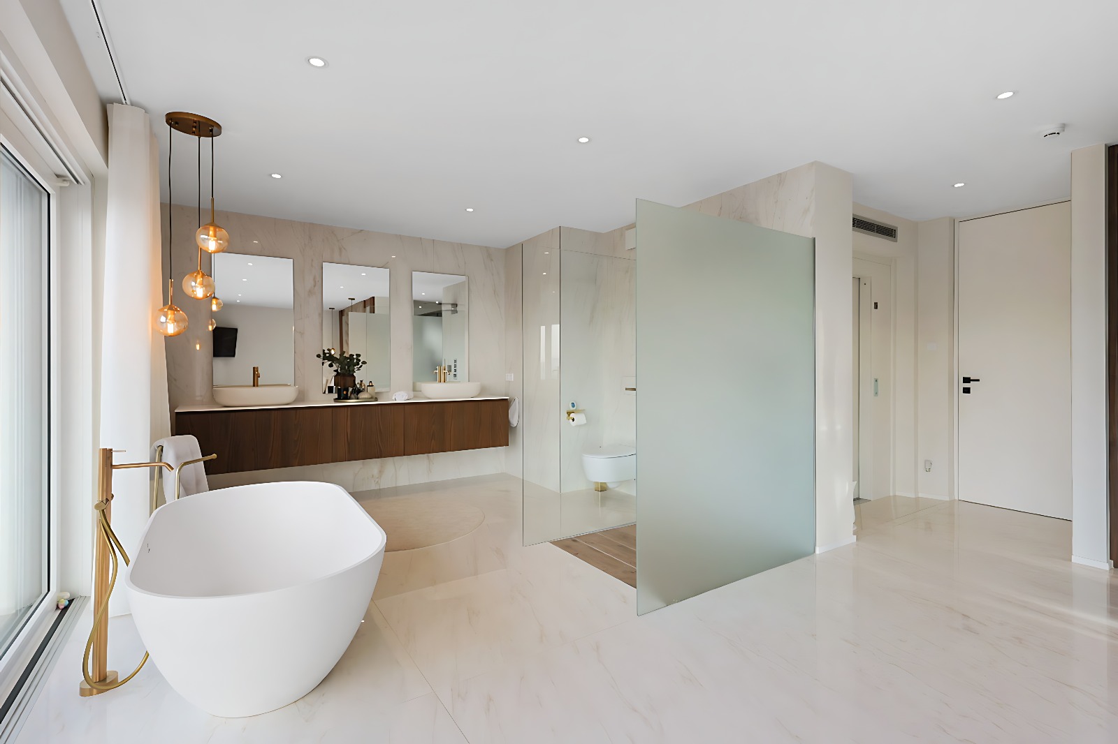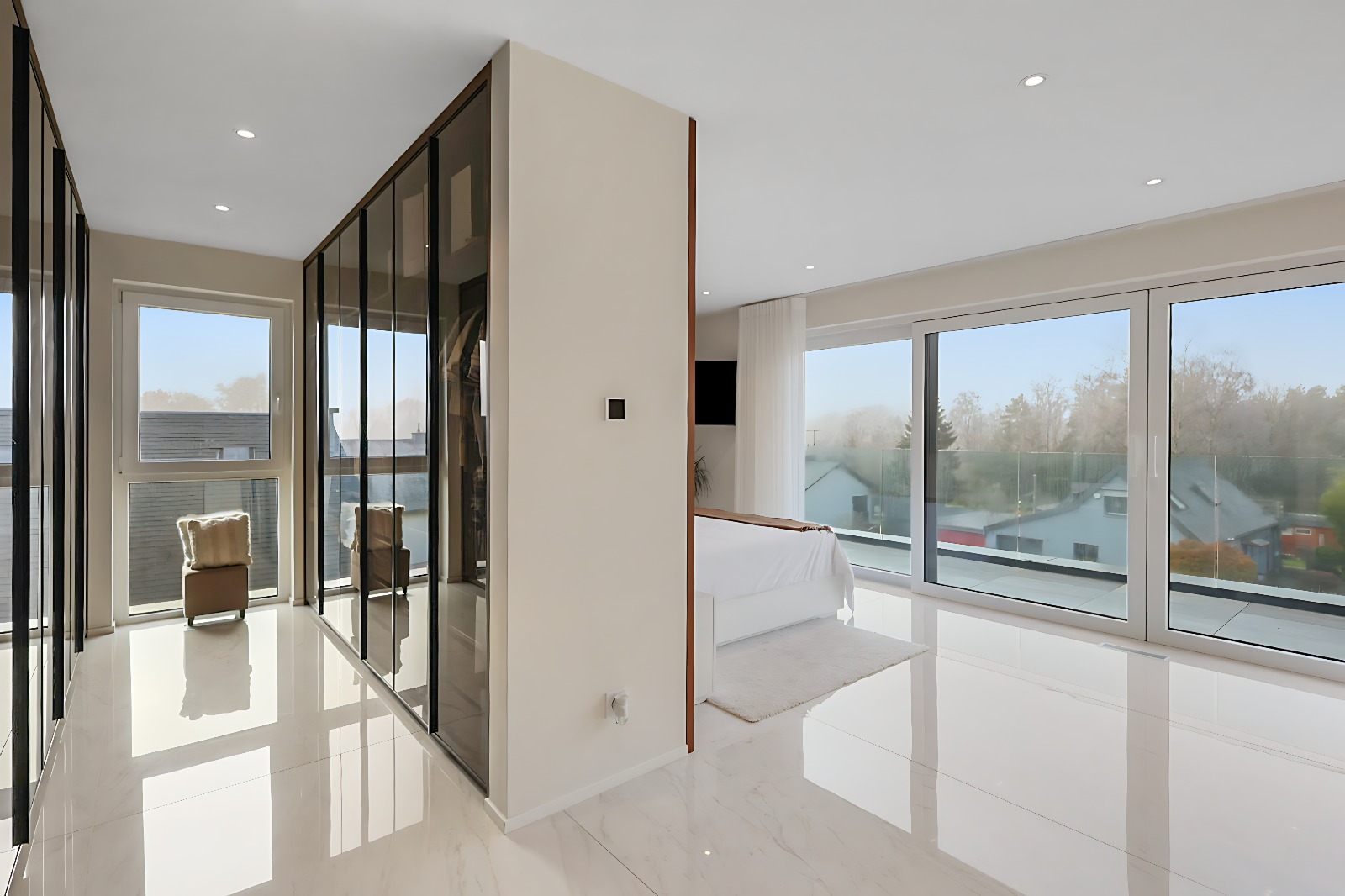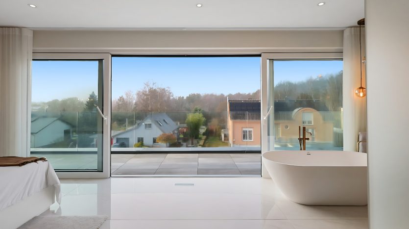 – Suite parentale d’exception avec ascenseur arrivant directement dans la chambre, grand dressing sur mesure, salle de bains privative (douche italienne ouverte, baignoire, double vasque), ainsi qu’une terrasse privée avec vue dégagée,