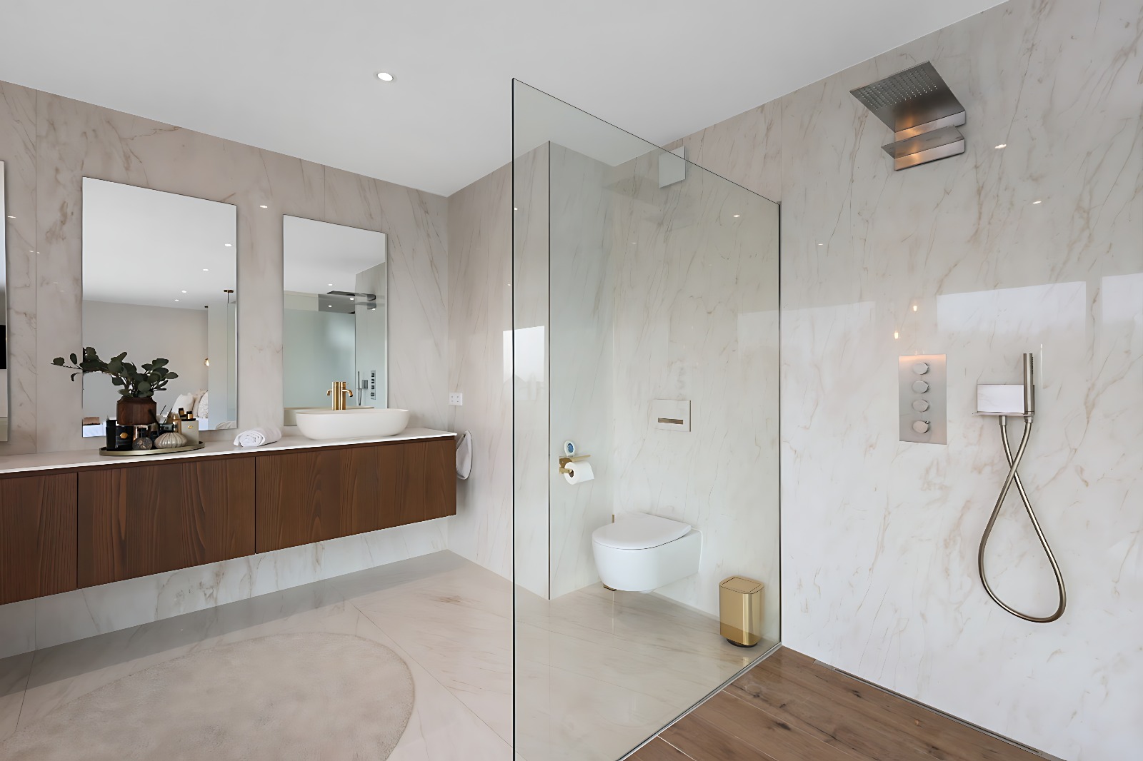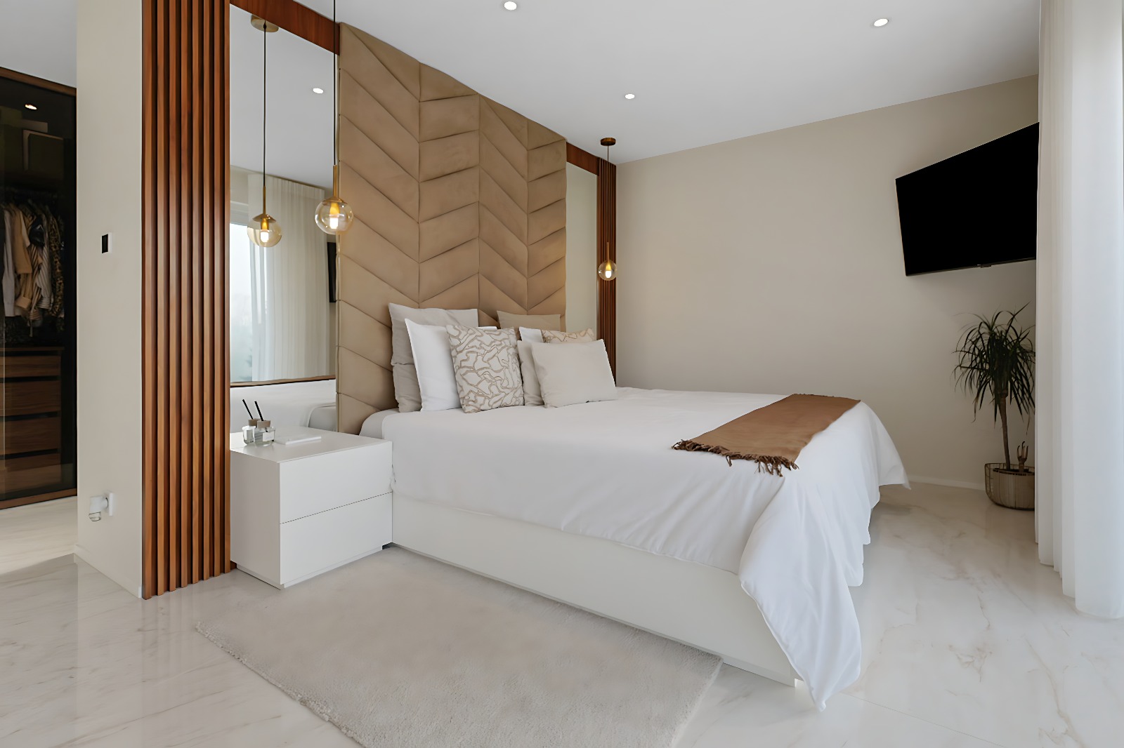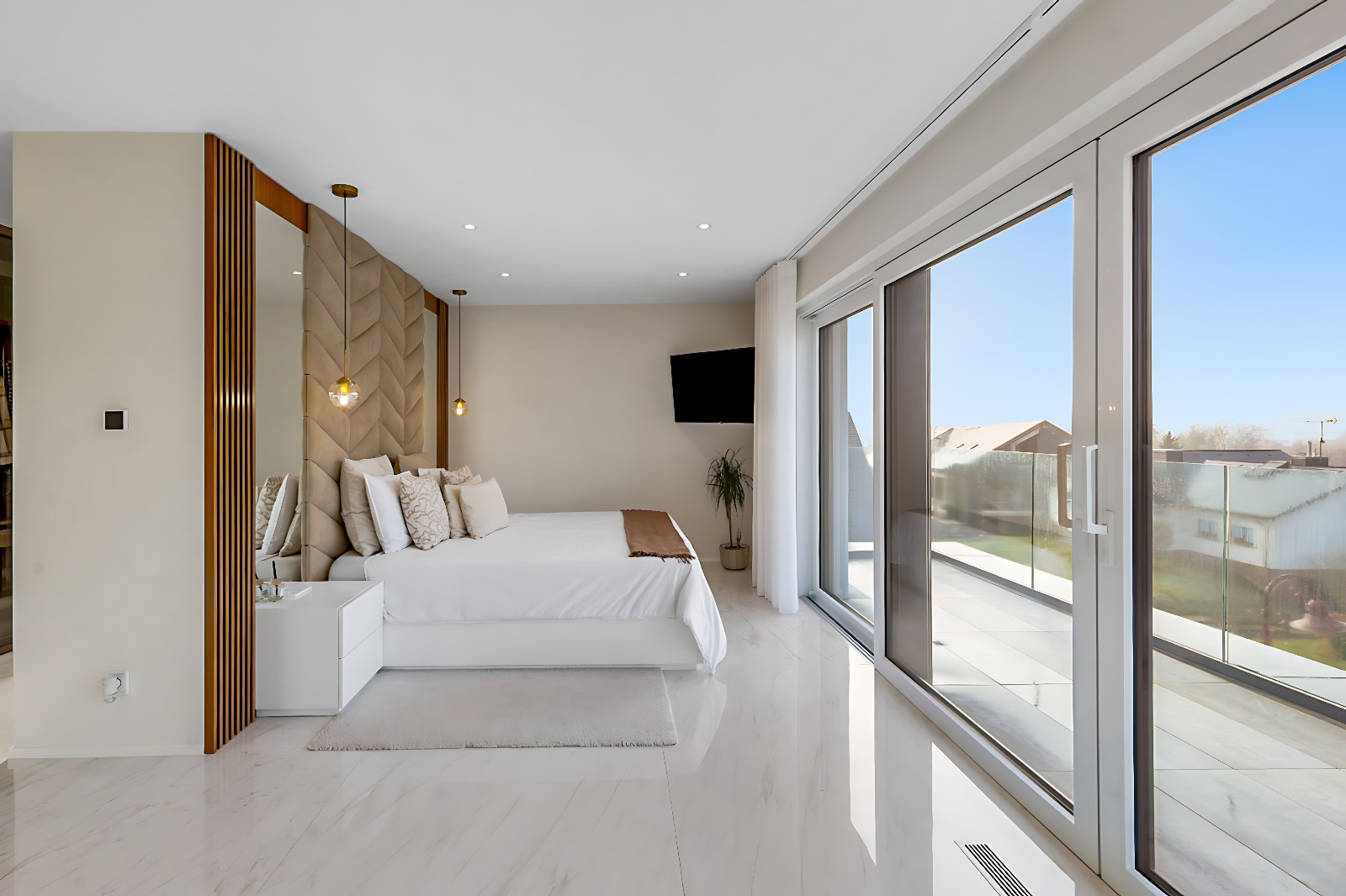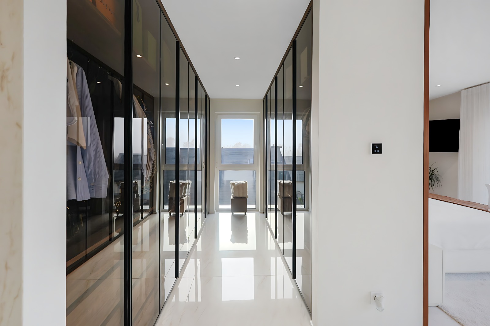– Suite parentale d’exception avec ascenseur arrivant directement dans la chambre, grand dressing sur mesure, salle de bains privative (douche italienne ouverte, baignoire, double vasque), ainsi qu’une terrasse privée avec vue dégagée,